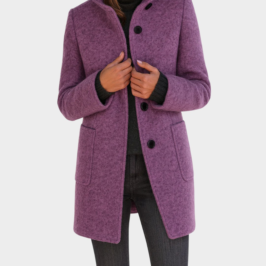 Confeccionado en un tejido suave tipo lana, este abrigo ofrece una sensación cálida y agradable al tacto. Su corte recto y estructura ligera estilizan la figura, mientras que los bolsillos delanteros aportan comodidad y practicidad.
